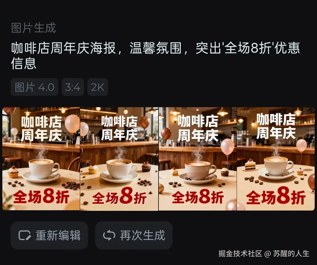 输入:"咖啡店周年庆海报,温馨氛围,突出'全场8折'优惠信息"