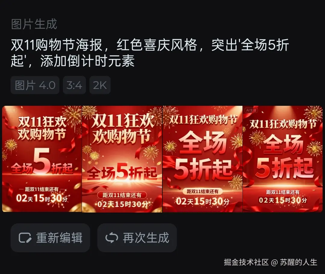 输入活动信息:"双11购物节海报,红色喜庆风格,突出'全场5折起',添加倒计时元素"