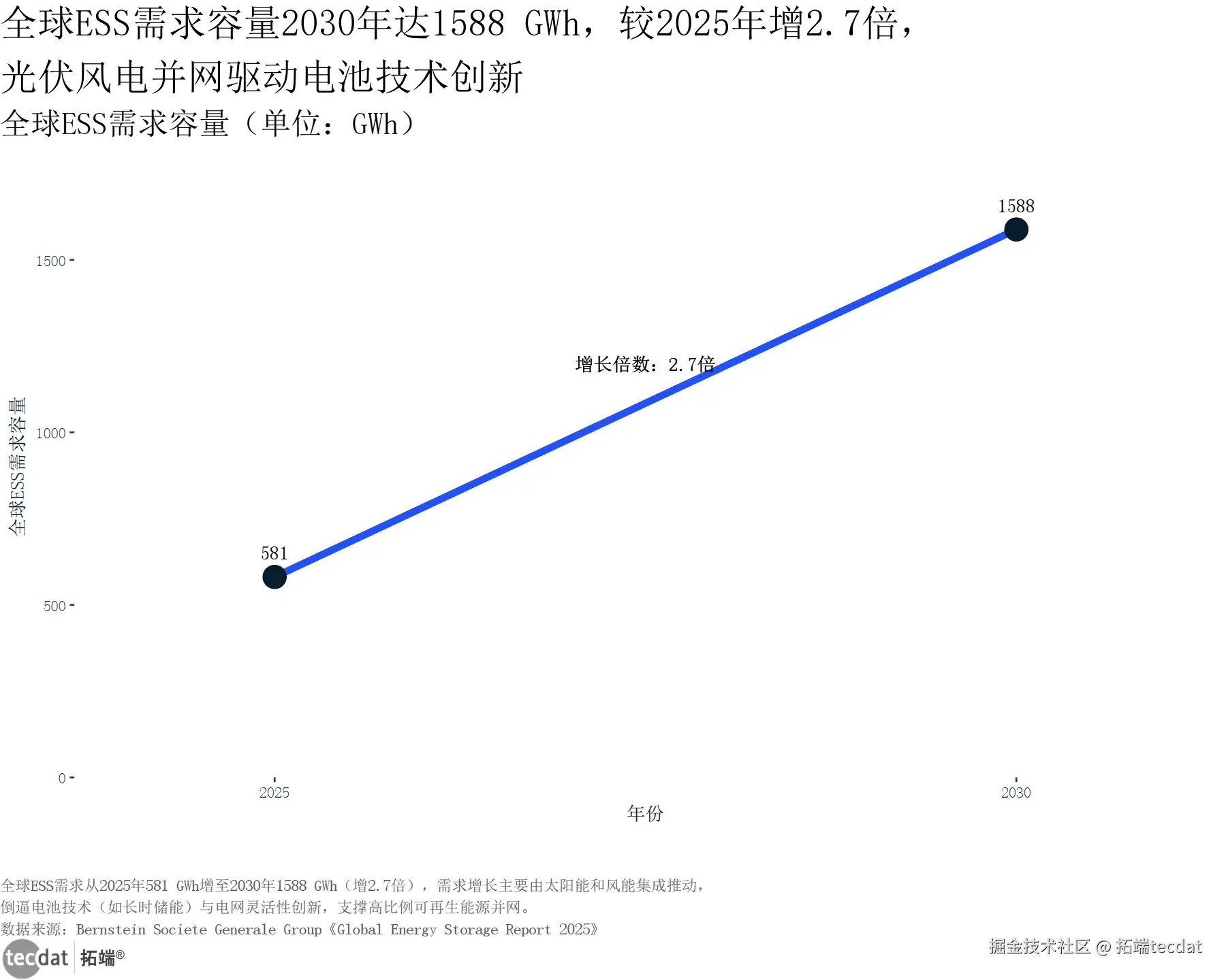 全球一次能源供应2040年将达峰值696EJ,之后缓慢下降,2060年降至670EJ,能效提升与可再生能源替代是核心驱动因素。非化石能源份额从2024年19.7%增至2060年62.7%,2050年达49.3%(接近化石能源占比),2050年成为能源结构转型分水岭。全球ESS(储能系统)需求2030年达1588GWh,较2025年增长2.7倍,光伏风电并网需求驱动电池技术持续创新。