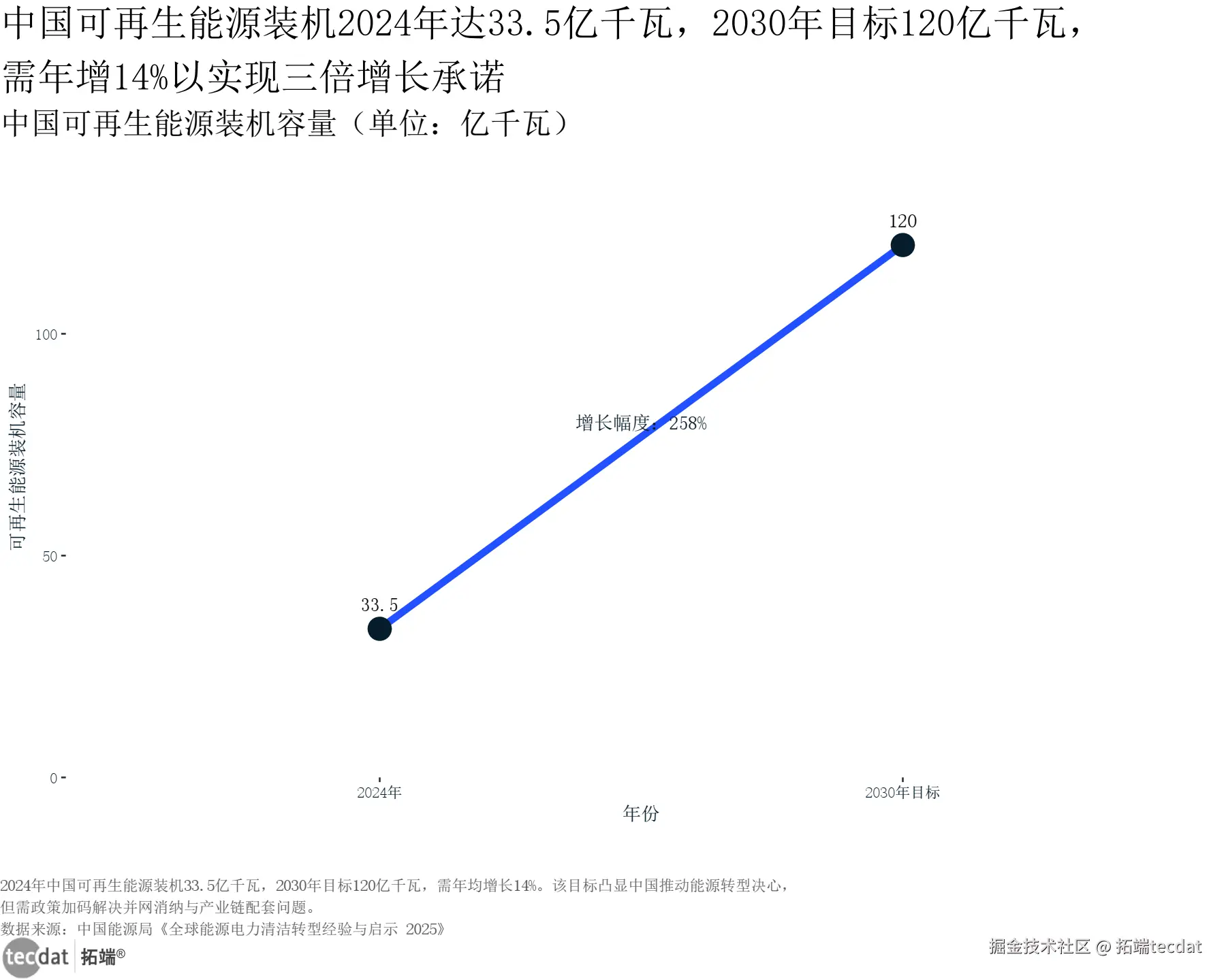 2024年中国可再生能源装机33.5亿千瓦,2030年目标120亿千瓦,增长幅度标注清晰。3秒解读:目标宏伟需加速装机落地;对应人群行动建议:能源企业可加大西部光伏、风电项目布局,政策制定者可简化并网流程与用地审批。