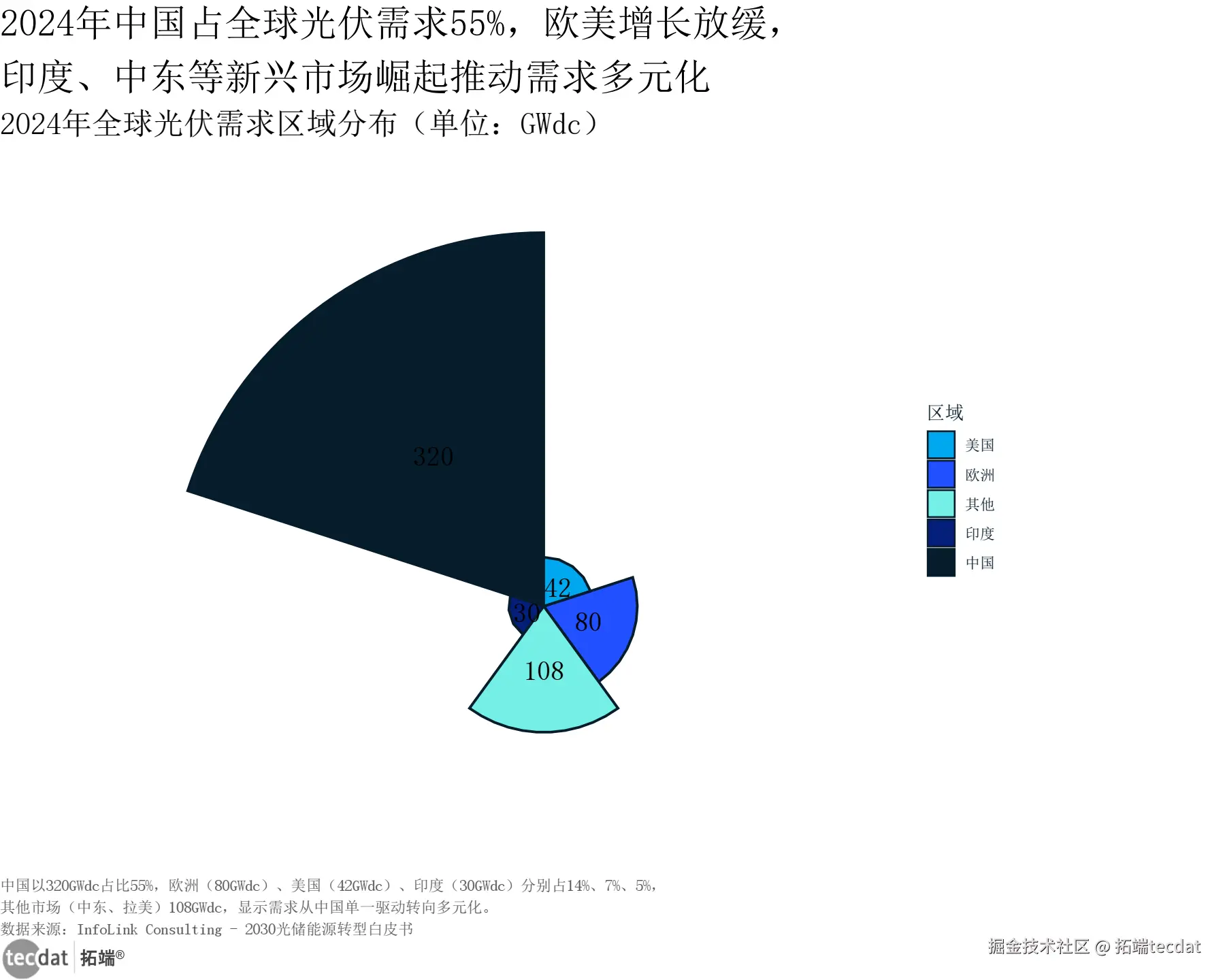 2024年全球光伏需求呈现多区域协同驱动格局,中国以320GW需求占比55%,欧洲(80GW)、美国(42GW)、印度(30GW)分列二至四位,其他市场合计108GW。3秒解读:需求结构从中国单一驱动转向多区域均衡增长;对应人群行动建议:企业可按区域需求特点定制产品(如欧洲市场侧重双面组件与碳足迹合规),进群获取各区域市场准入指南。