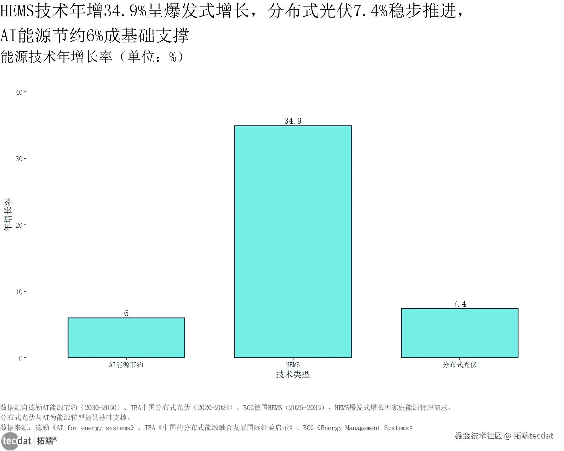 HEMS技术(34.9%)增速远超分布式光伏(7.4%)、AI能源节约技术(6%)。3秒解读:家庭能源管理是新能源行业的新兴蓝海市场;对应人群行动建议:科技企业可聚焦HEMS产品研发,能源企业可与家电厂商开展合作,构建“硬件+软件+服务”生态。