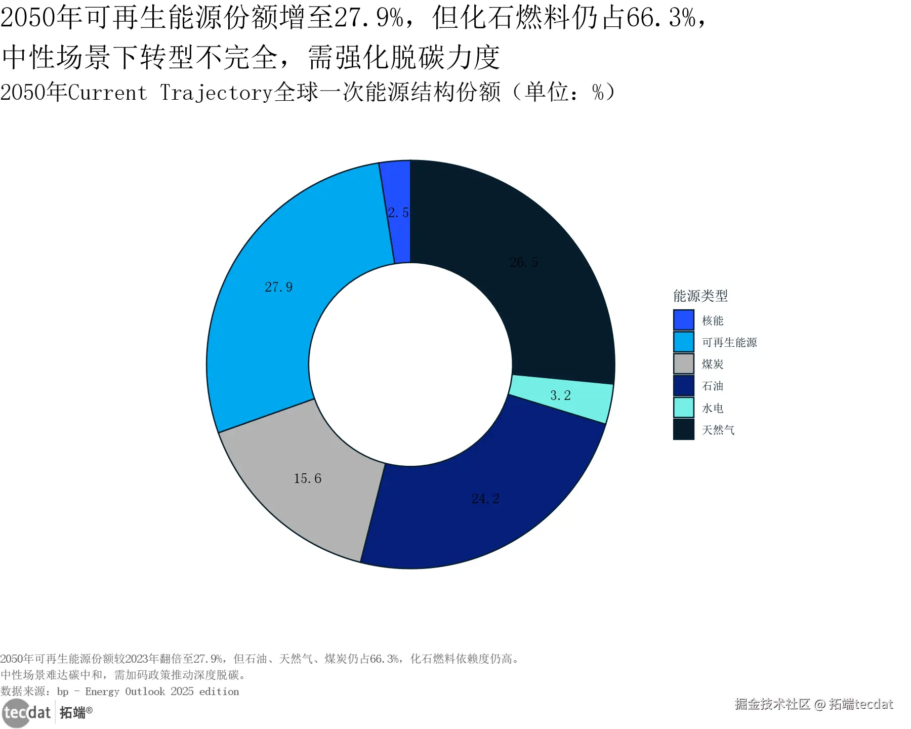 2050年中性场景下,可再生能源占比提升至27.9%,煤炭占比降至15.6%,但石油(24.2%)、天然气(26.5%)仍占据重要地位。3秒解读:中性场景下能源转型仍不充分,需强化脱碳力度;对应人群行动建议:政策制定者需加码碳定价机制与新能源补贴政策,企业可提前布局长时储能、氢能等技术储备。