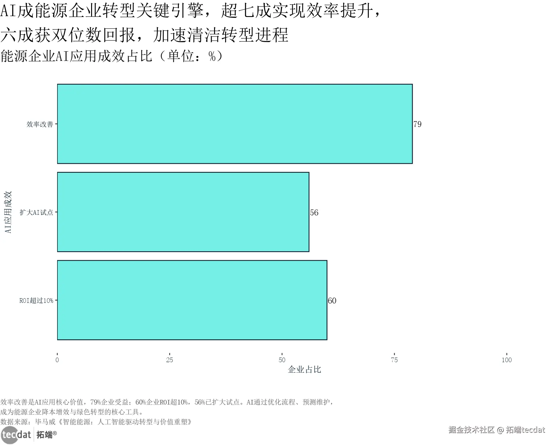 AI已成为能源企业转型的核心引擎,79%的应用企业实现运营效率提升,60%的企业获得双位数投资回报。3秒解读:AI在能源行业的核心价值集中于流程优化与预测性维护;对应人群行动建议:能源企业可优先在运维、调度环节部署AI工具,中小企业可采用SaaS模式降低技术应用门槛。