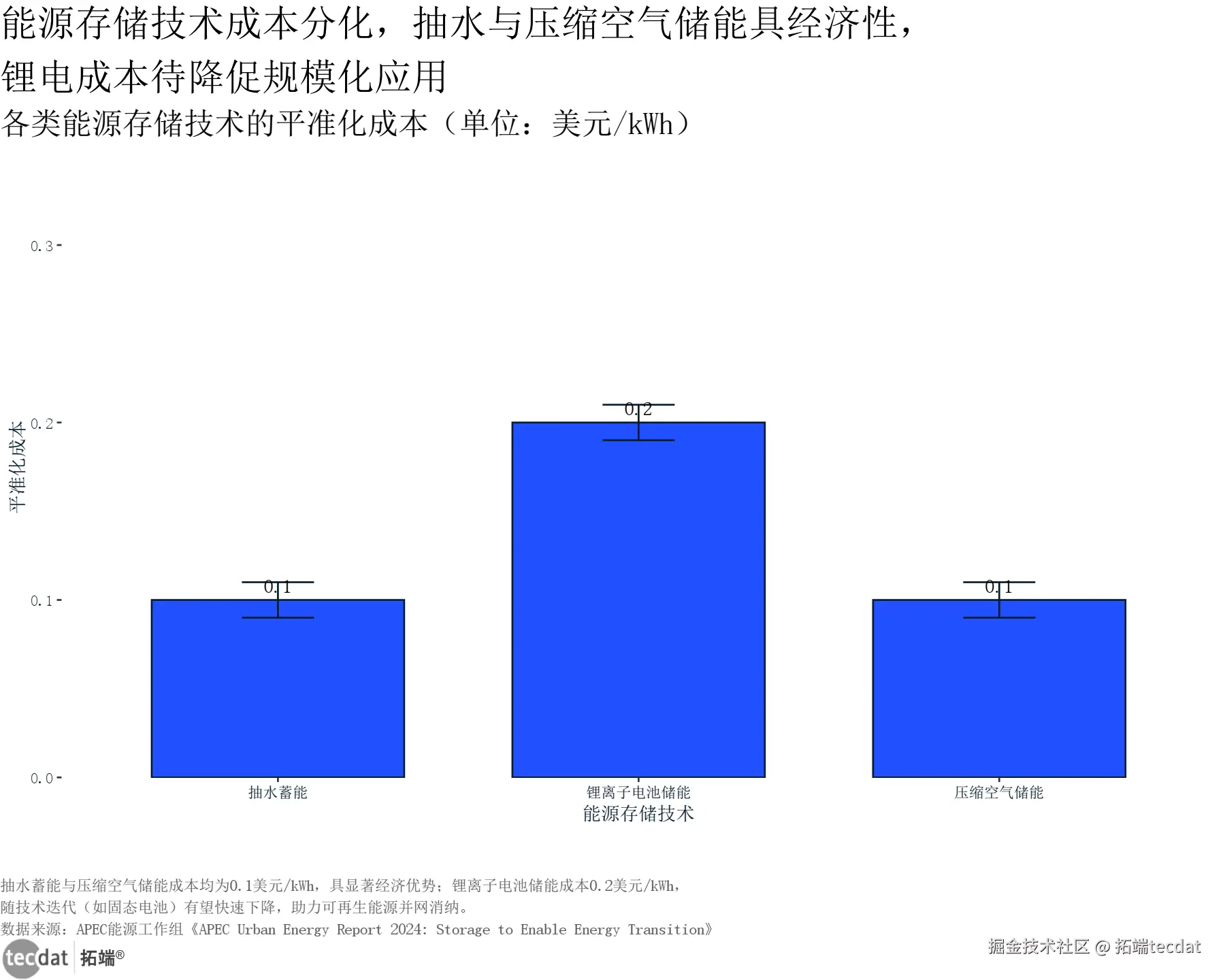 该图表对比三类主流储能技术的平准化成本,抽水蓄能与压缩空气储能均为0.1美元/kWh,锂离子电池储能为0.2美元/kWh。3秒解读:抽水蓄能与压缩空气储能具备更强的经济性,锂离子电池需通过技术迭代进一步降本;对应人群行动建议:电网侧储能项目优先选择抽水蓄能,用户侧可试点锂离子电池储能,同步关注固态电池等下一代技术进展。