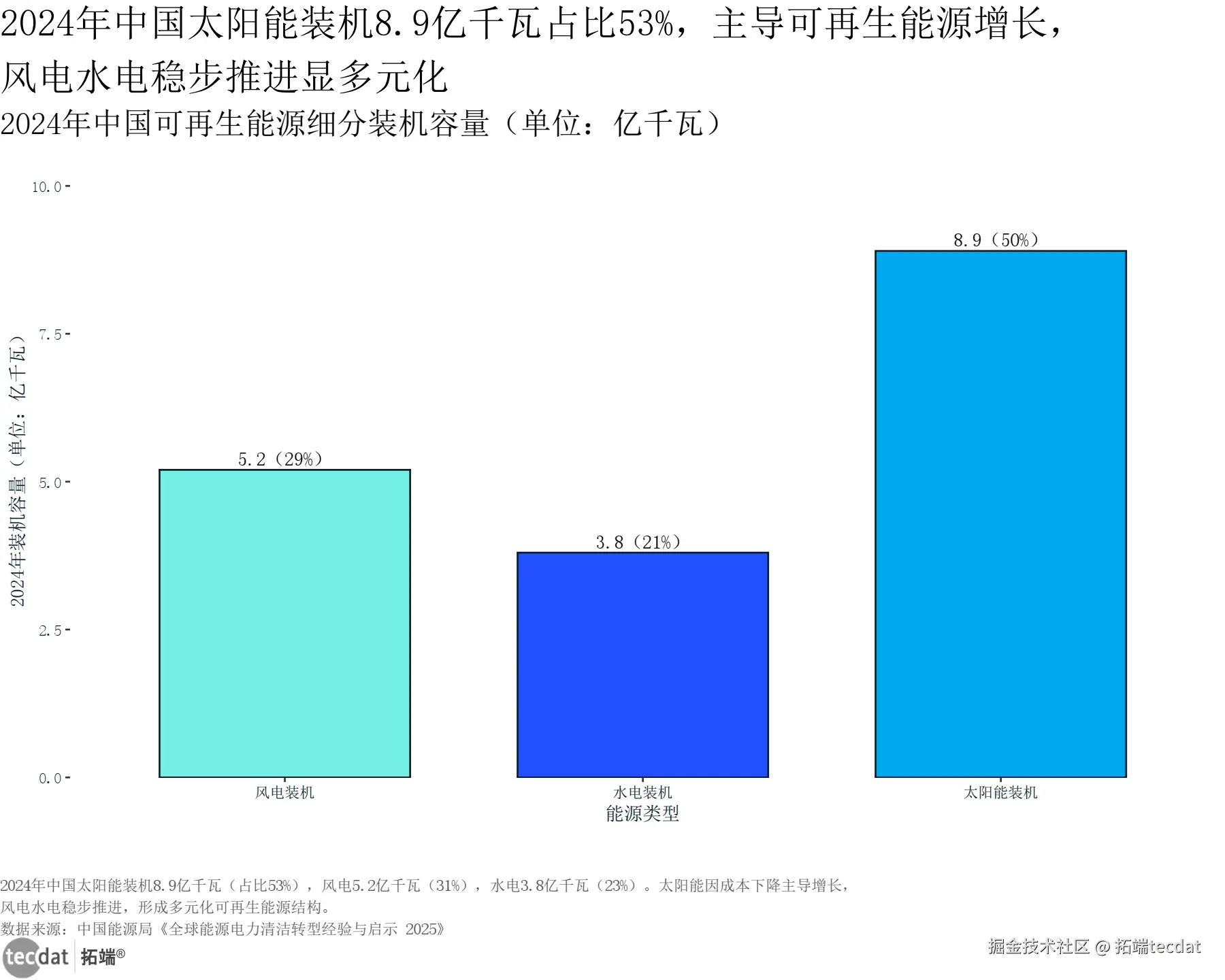 中国可再生能源装机结构呈现太阳能主导特征:太阳能(8.9亿千瓦)>风电(5.2亿千瓦)>水电(3.8亿千瓦),各类型占比标注明确。3秒解读:太阳能是当前中国可再生能源增长的核心极;对应人群行动建议:光伏企业可扩大产能规模,投资者可优先配置太阳能产业链优质标的。