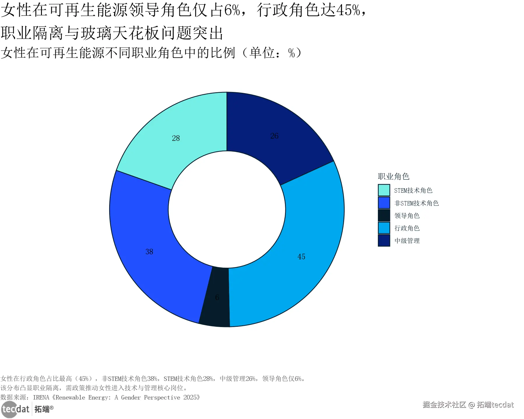 女性在可再生能源各职业角色中分布不均:行政角色(45%)>非STEM技术角色(38%)>STEM技术角色(28%)>中级管理(26%)>领导角色(6%)。3秒解读:女性集中于非核心业务岗位,技术与管理岗位参与度不足;对应人群行动建议:企业可推出“女性技术领导力计划”,高校可加强女性STEM专业培养力度。