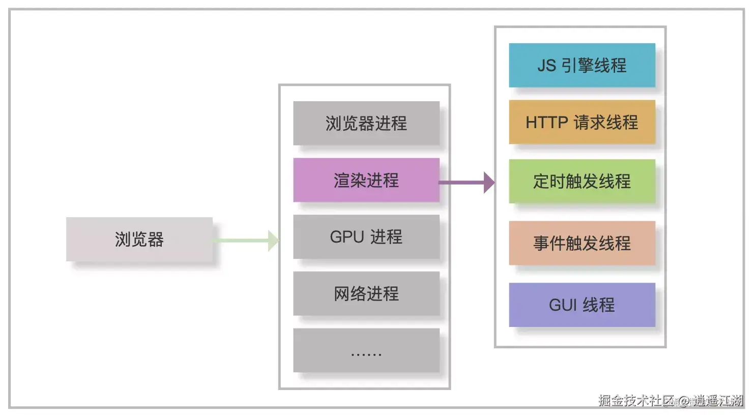 以 Chrome 为例,浏览器不仅有多个线程,还有多个进程,如渲染进程、GPU 进程和插件进程等。而每个 tab 标签页都是一个独立的渲染进程,所以一个 tab 异常崩溃后,其他 tab 基本不会被影响。作为前端开发者,主要重点关注其渲染进程,渲染进程下包含了 JS 引擎线程、HTTP 请求线程和定时器线程等,这些线程为 JS 在浏览器中完成异步任务提供了基础。