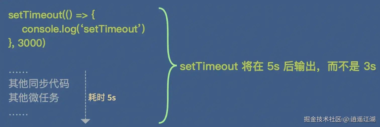 事件循环中,总是先执行同步代码后,才会去任务队列中取出异步回调来执行。当执行 setTimeout 时,浏览器启动新的线程去计时,计时结束后触发定时器事件将回调存入宏任务队列,等待 JS 主线程来取出执行。如果这时主线程还在执行同步任务的过程中,那么此时的宏任务就只有先挂起,这就造成了计时器不准确的问题。同步代码耗时越长,计时器的误差就越大。不仅同步代码,由于微任务会优先执行,所以微任务也会影响计时,假设同步代码中有一个死循环或者微任务中递归不断在启动其他微任务,那么宏任务里面的代码可能永远得不到执行。所以主线程代码的执行效率提升是一件很重要的事情。