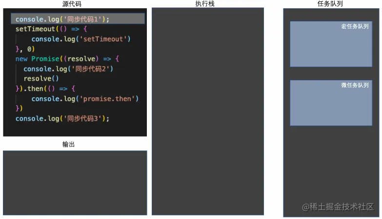 上面的代码将按如下顺序输出为:"同步代码 1"、"同步代码 2"、"同步代码 3"、"promise.then"、"setTimeout",具体分析如下。