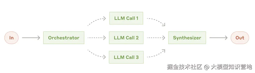 当无法预测所需子任务时,可以采用「协调者-辅助者」工作流,先由协调者LLM动态分解任务,子任务委托给不同的辅助者LLM,并综合其结果。