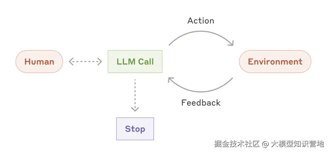 - 执行:在执行过程中,每一步都能从环境中获取“真实情况”(如工具调用结果或代码执行),以评估自身进度;还可以在检查点或遇到阻塞时暂停,以获取人类反馈。