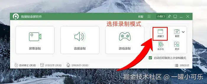 第1步:我们先打开数据 蛙录屏软件,主界面上会直接显示各种录制模式,咱们今天就以常用的 “窗口录制” 来举例,在页面右侧选中这个模式就行。