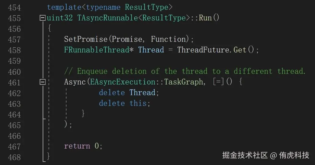 TAsyncRunnable是一种特殊类型,它接收一个Function、Promise或Future作为参数。观察其Run方法:在SetPromise时会执行我们指派的任务。这个FRunnable和FRunnableThread对象是匿名的,外部代码仅进行New而不Delete,其生命周期由TAsyncRunnable自身托管。具体的清理做法是将删除操作提交至任务队列(TaskGraph)。之所以不立即Delete,是因为此时Run函数可能尚未执行完毕,立即Delete自身可能导致异常情况。