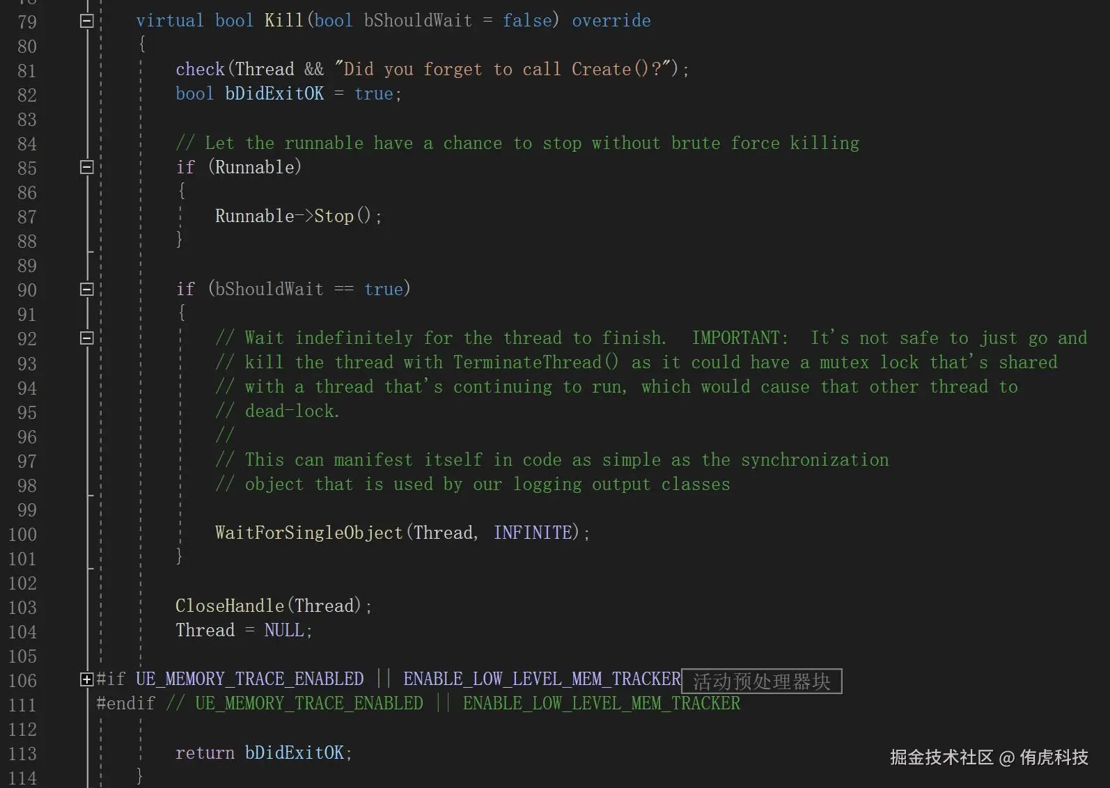 - Kill:结束线程,UE建议不要用操作系统的Kill接口,强杀线程会导致泄露和死锁,应该调用Runnable的Stop方法。