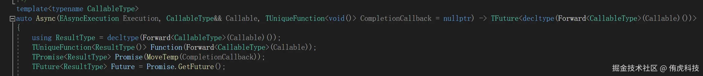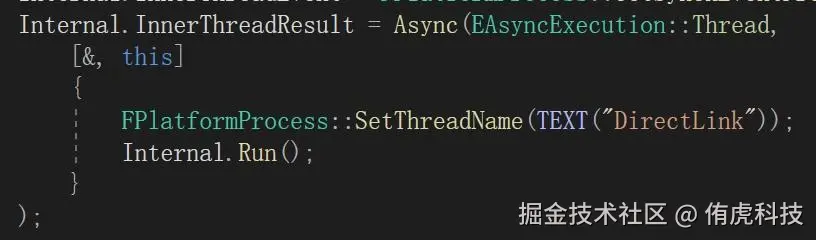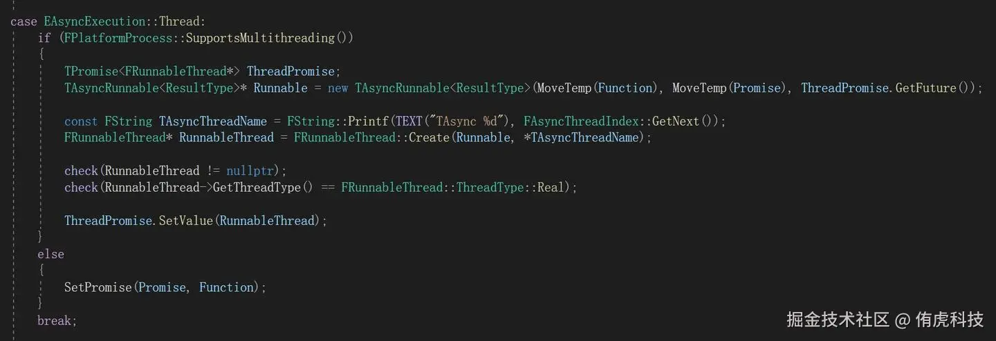 创建了一个TAsyncRunnable对象,把Function和Promise传入其中,Promise可理解为上面的CompletionCallback,然后通过FRunnableThread::Create接口创建新线程,执行该Runnable。