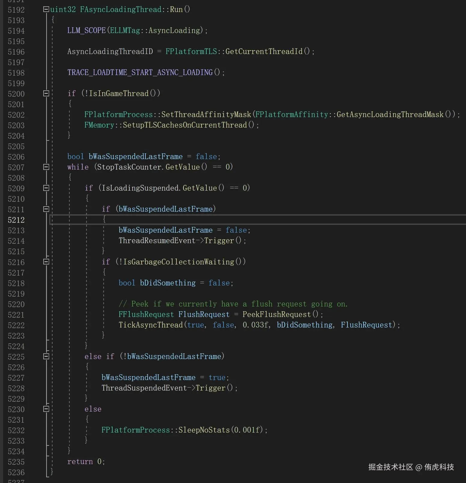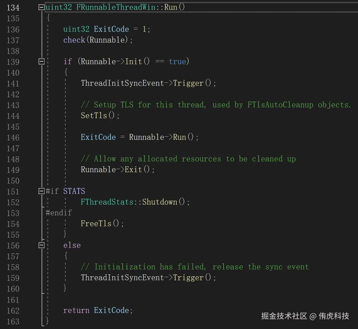 _ThreadProc函数先向UE的线程管理类注册改线程,然后进入FRunnableThreadWin::Run函数,真正开始逻辑,注意这个Run函数和FRunnable的Run毫无关系。