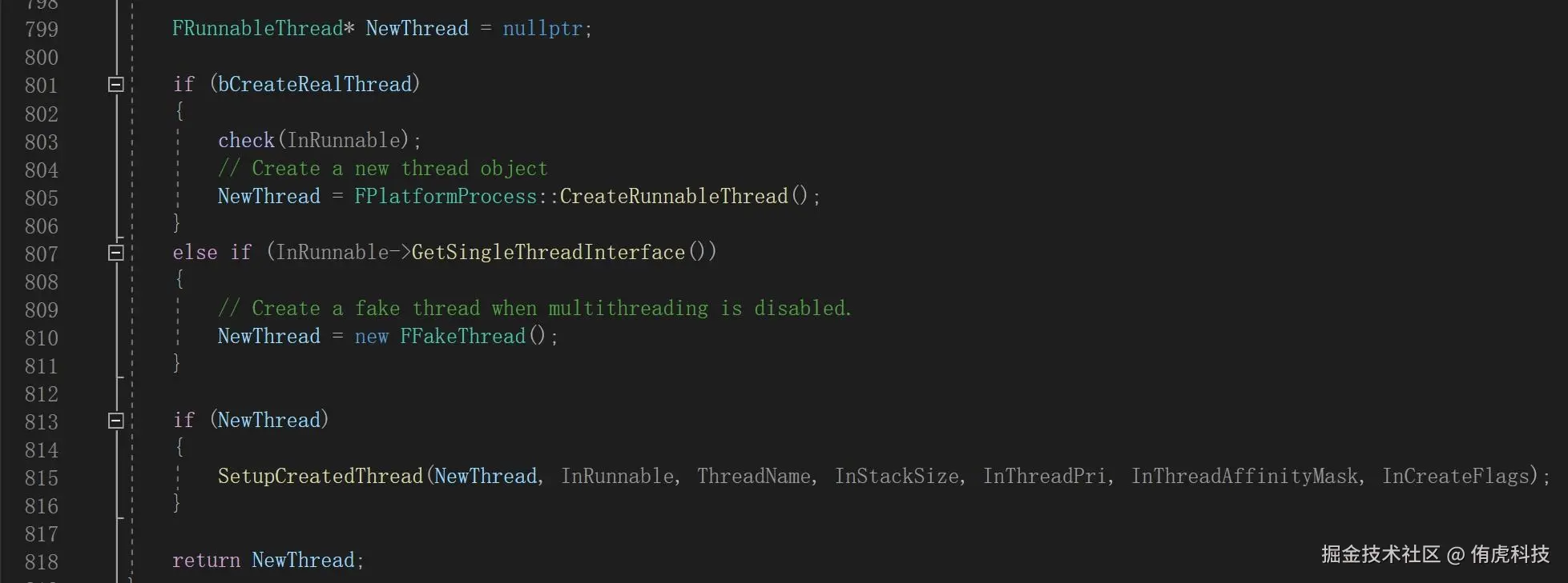 函数内部首先创建NewThread对象,Windows平台即FRunnableThreadWin。如果当前设置了强制单线程模式,还可选创建FakeThread,通过Tick驱动执行。