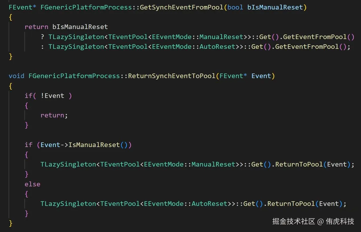 UE使用FEvent类型表示一个Event,有Wait、Trigger、Reset等接口。而且Event是内核对象,创建比较昂贵,因此UE使用EventPool来管理这些Event,根据ManualReset分成两个Pool。