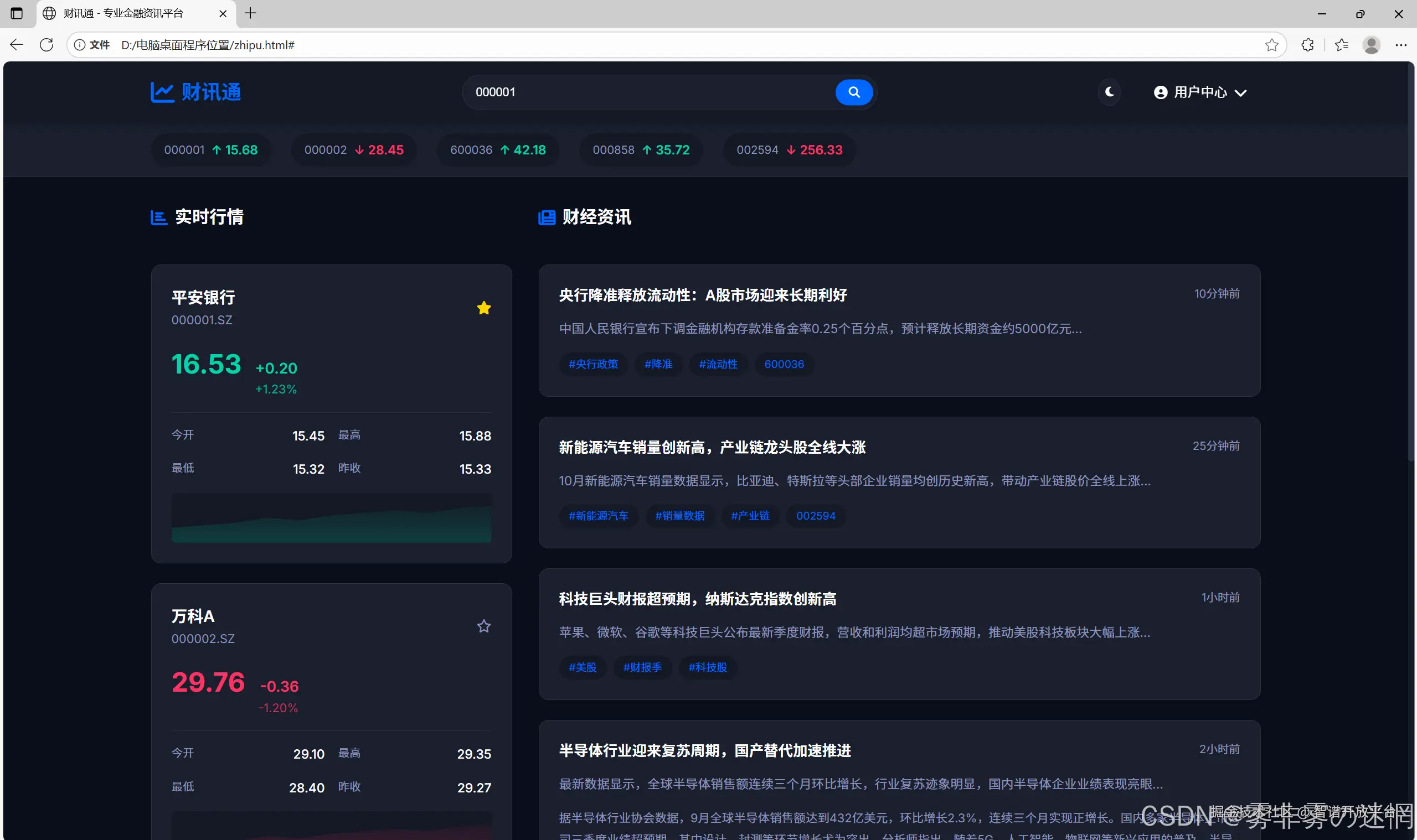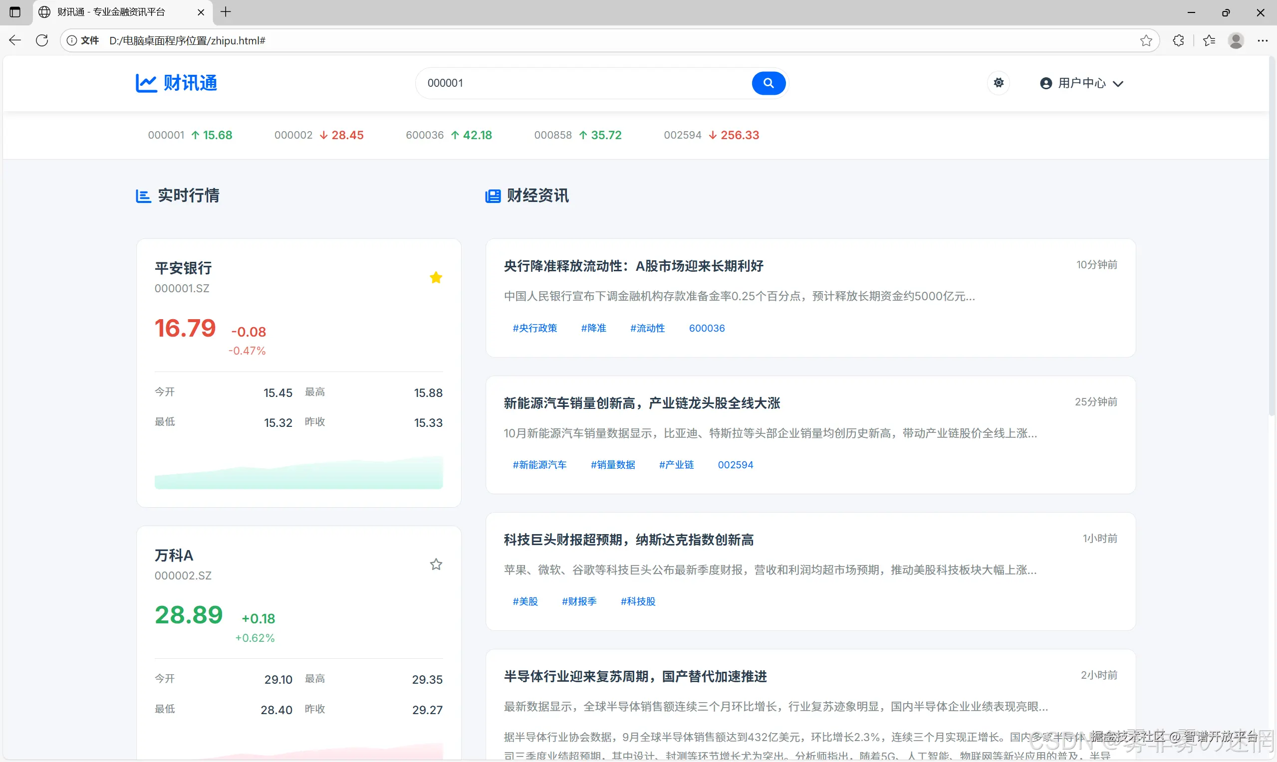 ` 请生成一个股票新闻聚合网页源码,风格为 “专业金融资讯平台”。包含: