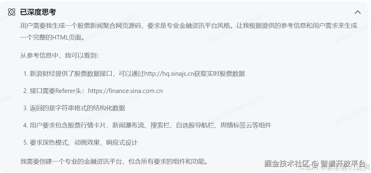 在智谱 GLM-4.6 生成股票新闻聚合网页的体验中,我最深的感触是:它对金融场景的专业细节把控,细腻到超出预期,作为金融资讯类网页的原型,它已经能直接承载 “行情跟踪 + 资讯阅读” 的核心需求。更关键的是,它不是简单的界面拼接,而是真的理解了金融领域 “数据要准、交互要顺、视觉要专业” 的底层逻辑 —— 用 AI 做专业场景的网页原型,这效率和质感,确实超出了我的期待!