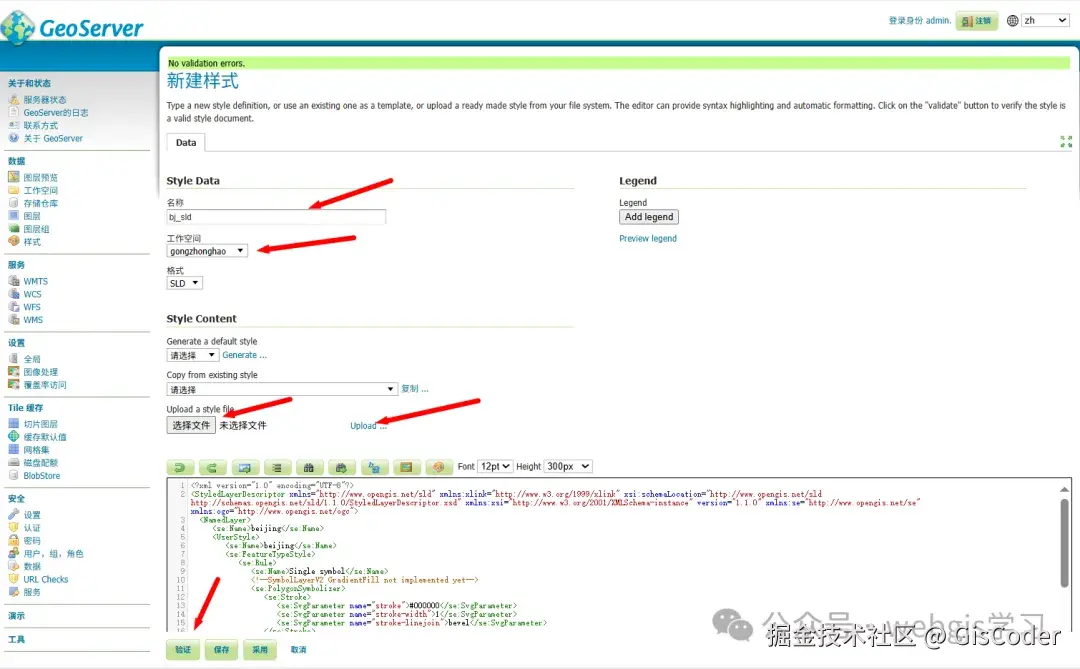 7、新建样式(如果不需要自定义样式,请忽略步骤7-9)。设置样式名称,工作空间,上传步骤6里导出的sld样式文件,并点击“upload”。然后点击“验证”按钮看样式是否有问题。没问题的话,点击保存。