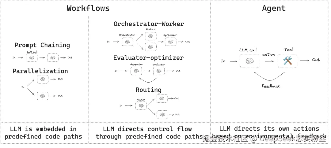- LLM 在预设好的工作流中运行。
