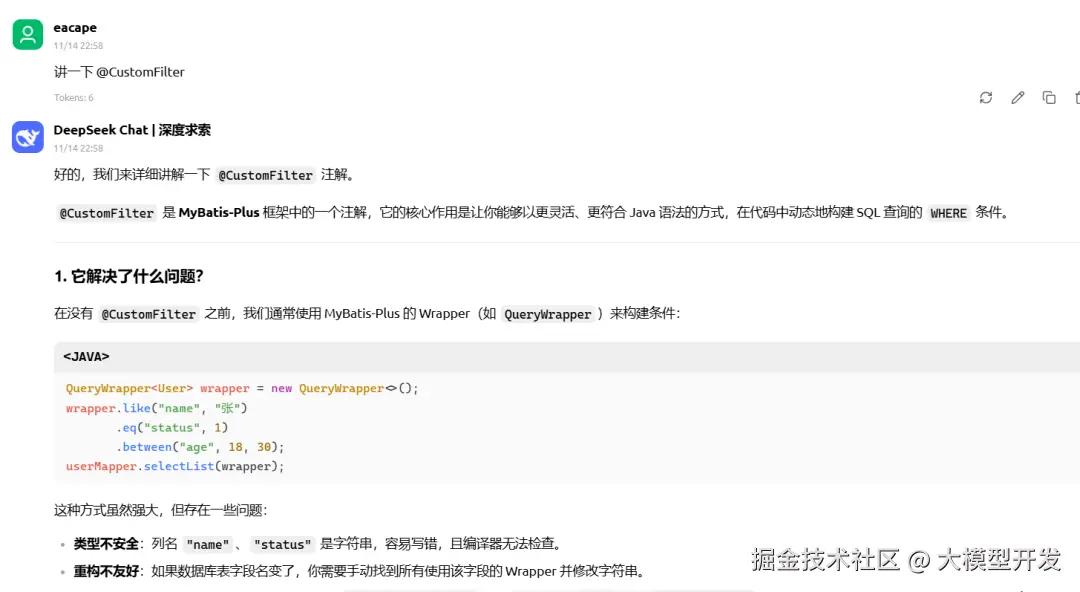 比如~我的代码里有一个名为@CustomFilter注解,这个注解大模型肯定不知道吧....下面是大模型的回答,我搜了下 Mybatis-Plus 并没有这个注解。