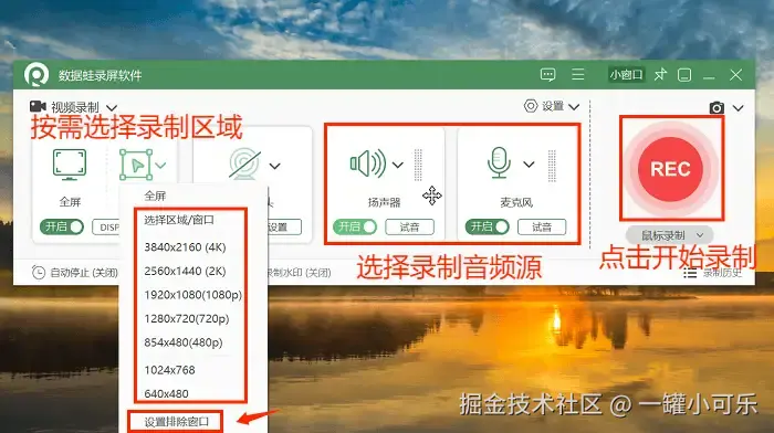 步骤2:选择录制区域,可以开启 “排除窗口录制” ,选择需要录制的音频源。还可以设置视频的输出格式。一切准备就绪后点击 “REC” 开始录制。