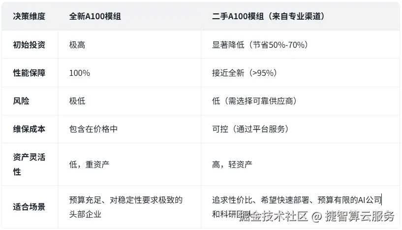 ● 故障率与维保成本: 全新模组享有3-5年的原厂保修,而二手模组通常没有。如果采购的二手模组质量差,频繁的故障将带来高昂的维修成本和业务中断损失。但若选择提供质保和维修服务的供应商,这部分风险就能被有效对冲。捷智算提供的二手A100模组配套维修服务,本质上是一种可控的、低成本的维保方案。