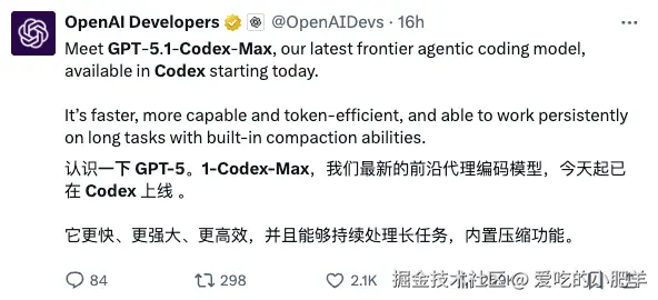 而作为死对头的OpenAI,在今天发布了GPT-5.1-Codex-Max,现在可以直接在codex中使用。