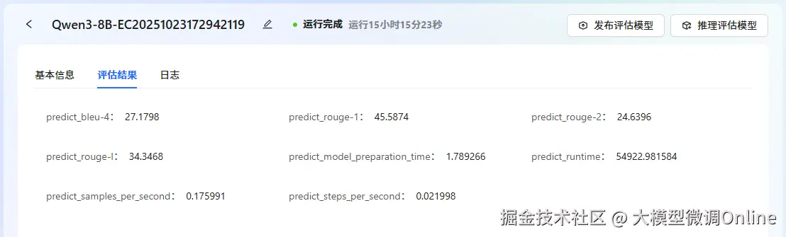 评估结果显示,微调后的模型在BLEU-4、ROUGE-1/2/L等核心指标上均有显著提升: