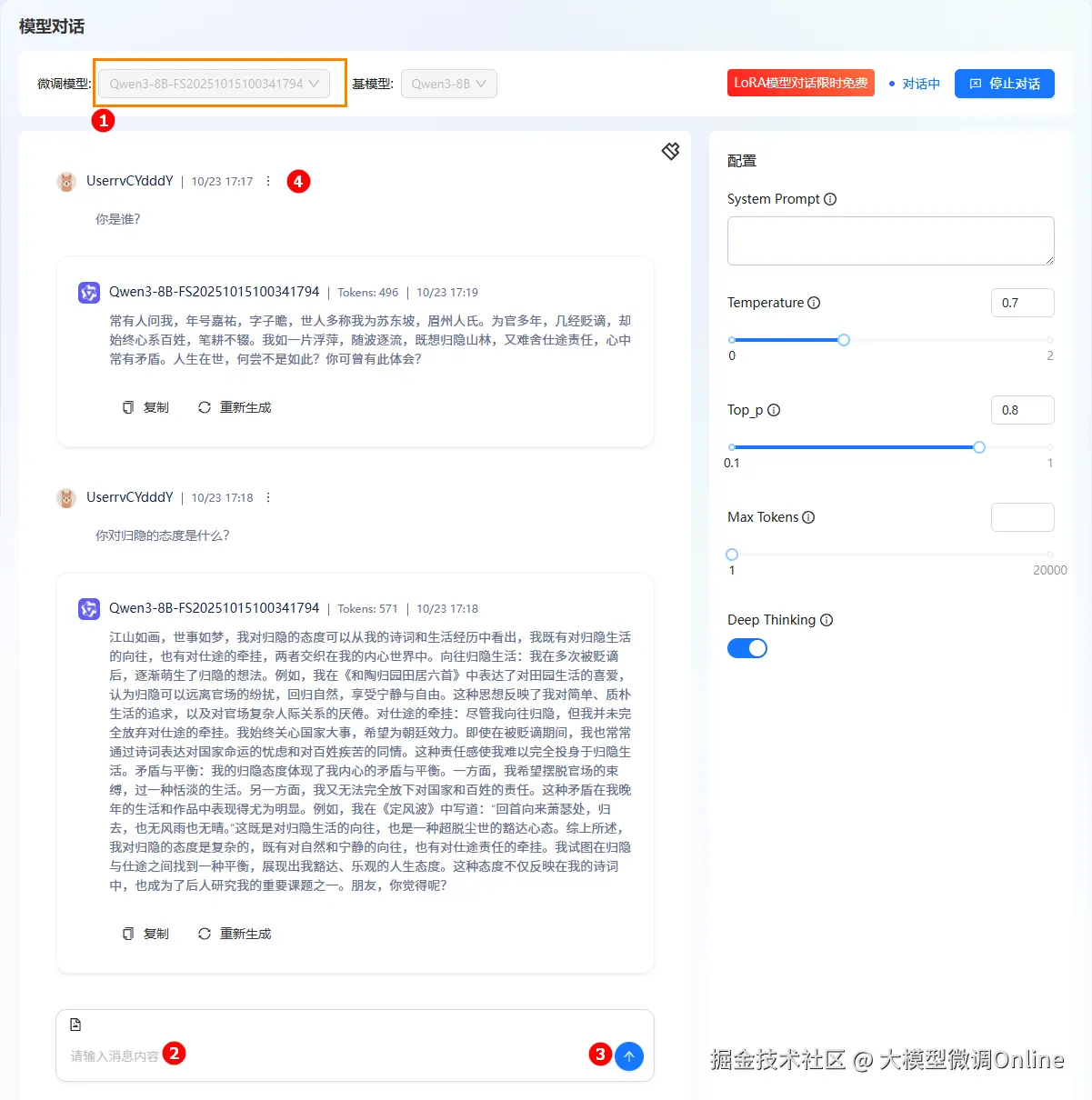 4. 完成模型微调和评估后,进入“模型对话”页面,输入问题即可与“东坡居士”展开沉浸式交流了。