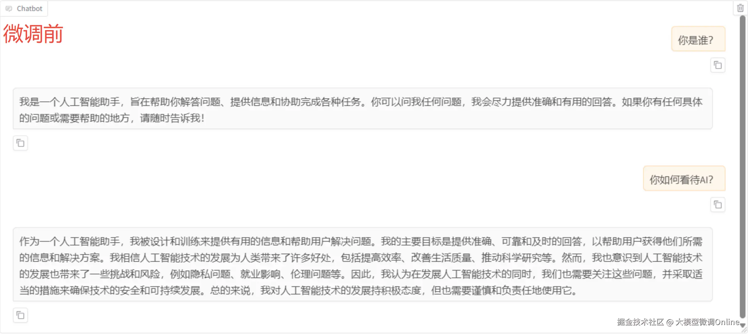这是微调前大模型的回答。此时的模型如同一个精准的“知识库”,回答客观专业、逻辑清晰,能够可靠地完成信息处理任务。然而其语言风格统一,缺乏个性与情感,更像一位严谨但缺少性格的“标准助手”。
