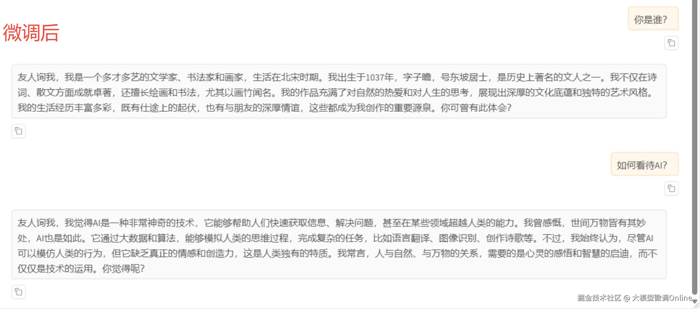 这是微调后大模型的回答。经过优化的模型成功“化身”为“苏东坡本人”,语言中自带文人的洒脱与哲思。它不仅传递知识,更展现出鲜明的性格特征与情感温度,实现了从“工具”到“对话伙伴”的转变,让历史人物真正“活”了过来。