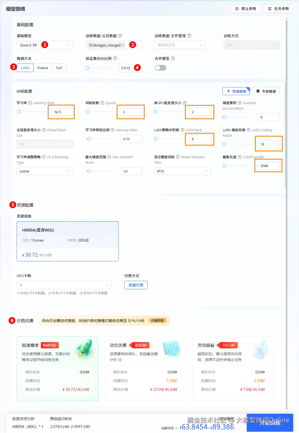 2. 选择基础模型(Qwen3-8B)和训练数据集(SUdongpo_merged),进行参数配置后(可参考下图),确认配置后,点击“开始训练”,等待约2小时即可完成。