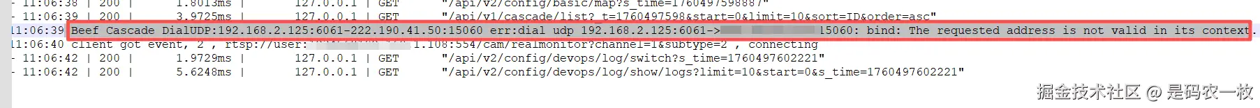 抓包无果后,我们转而分析EasyCVR的程序运行日志。在日志中,我们发现了关键报错信息:“本地IP无法连接到级联公网”。这条日志暗示,平台在尝试建立网络连接时,使用的本地IP地址可能存在问题。