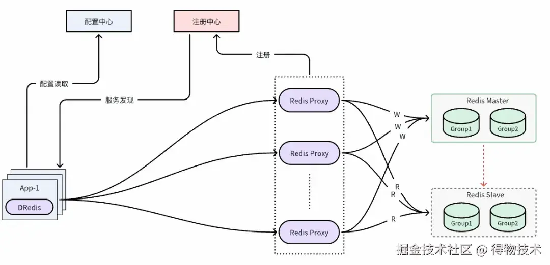 Redis-proxy 启动并且获取到集群拓扑信息后,自动注册到注册中心;可通过管控白屏化操作向配置中心配置集群使用的 proxy 分组与权重、就近读规则等信息;DRedis SDK 启动后,从配置中心获取到 proxy 分组与权重、就近读规则,从注册中心获取到 proxy 节点信息,然后与对应 proxy 节点建立连接;应用通过 DRedis SDK 访问数据时,DRedis SDK 通过加权轮询算法获取一个 proxy 节点(默认优先同可用区)及对应连接,进行数据访问。