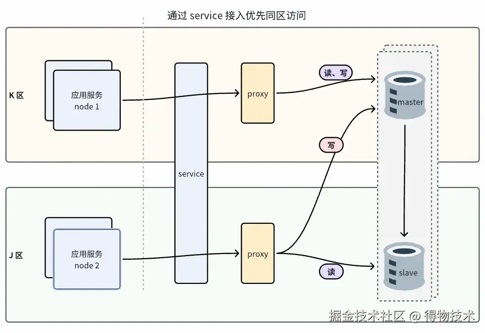 同城双活就近读场景下,业务访问 Redis 时,需要 SDK 优先访问同可用区proxy,proxy 优先访问同可用区 server节点,其中proxy优先访问同区 server 节点由 proxy 实现,但是在自研 DRedis SDK 之前,LB 无法自动识别应用所在同区的 proxy 并自动路由,因此需要借助service 的同区就近路由能力,同城双活就近读需要通过容器 proxy+service 接入。