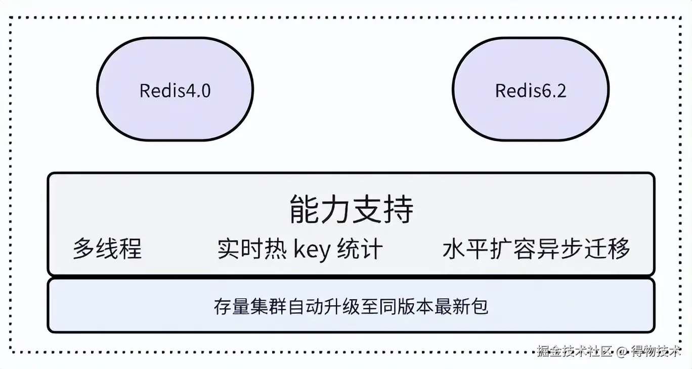 不管是 Redis4.0 还是 Redis6.2 版本,均支持了多线程特性、实时热 key 统计能力、水平扩容异步迁移 slot 能力,存量集群随着日常资源均衡迁移调度,集群节点版本会自动升级到同版本的最新安装包。