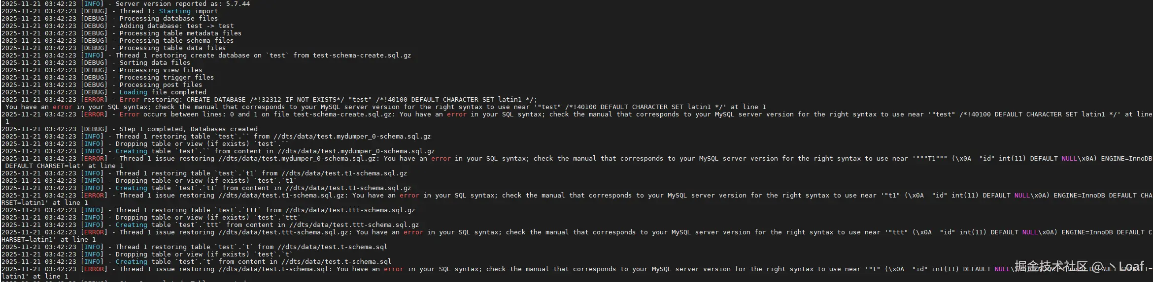 [root@localhost data]# myloader -o -v 3 -P 3306 -u root -p 'Qwer@123' -h 127.0.0.1 -d /dts/data -t 1 --serialized-table-creation --no-data -L /dts/log/table_structure_myloader.log