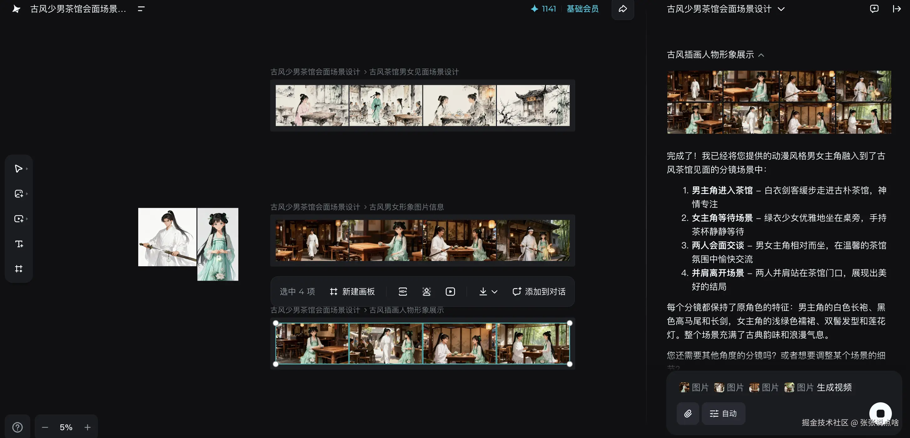 测试剧情(模拟连载漫剧常见场景):“古风少女带着玉佩在茶馆避雨,偶遇持剑的白衣公子,两人因玉佩对视”。对比核心:重点看 “多镜头下角色是否稳定” 和 “能否高效生成连贯动态剧情”,毕竟这是普通人做连载漫剧的最大障碍。