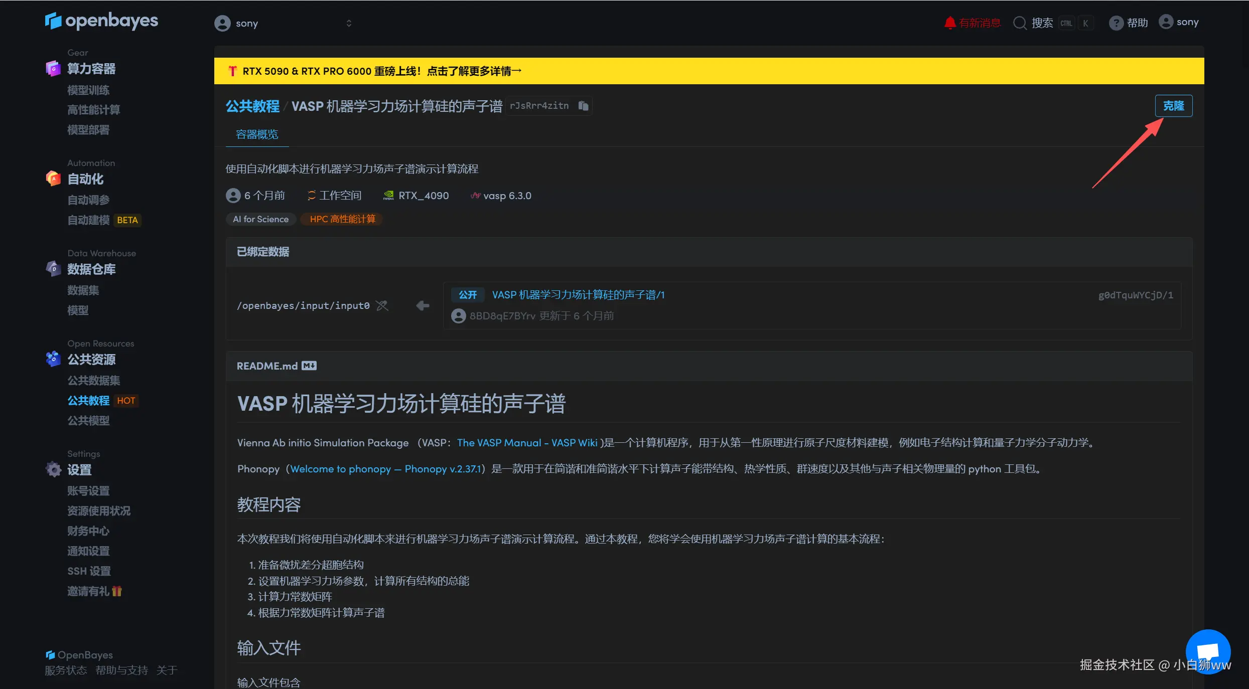 登录 OpenBayes.com,在「公共教程」页面,选择「VASP 机器学习力场计算硅的声子谱」教程。