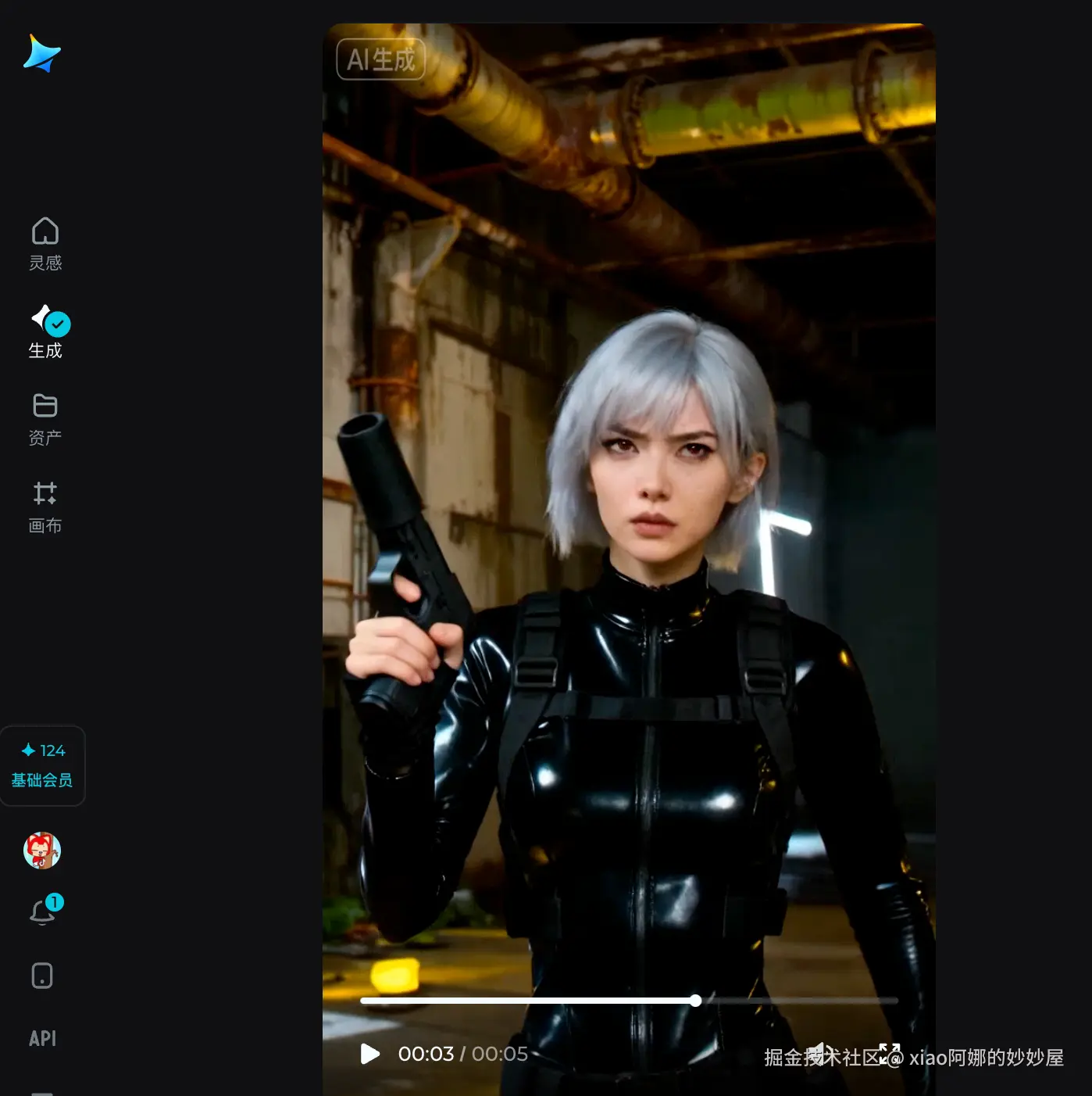 - 结果: 跑动时头发的甩动很自然,虽然动作幅度巨大,但当她停下来转身的那一刻,脸并没有崩。要知道,很多工具一遇到大动态,五官就糊成一团了,但即梦的“OmniHuman”系统似乎把骨骼锁得很死 。