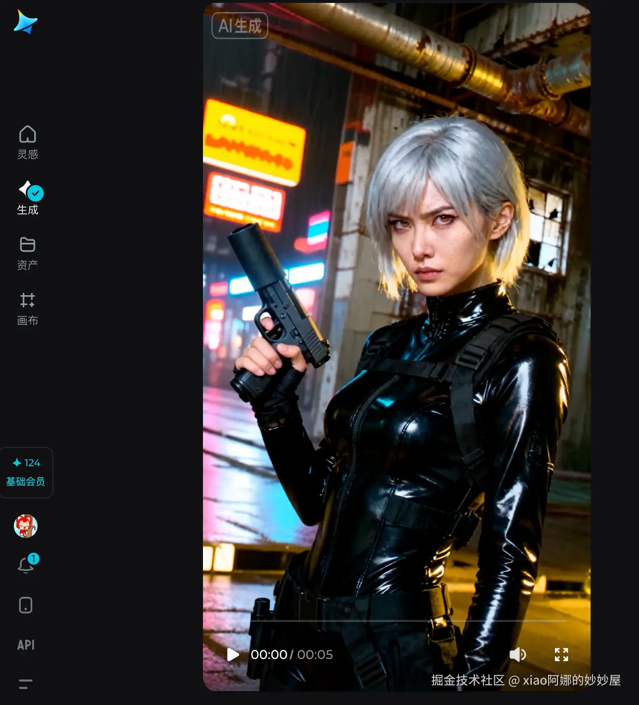 场景A(文戏): “她在下雨的霓虹街道上回头,眼神警惕,雨水顺着脸颊滑落。”
