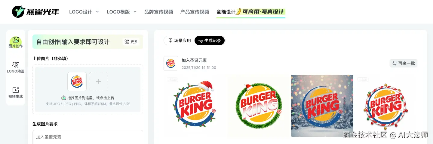 像我们用“燕雀光年”做这套方案时,完全没走传统流程:先在平台选“Logo动画创作”模式,上传汉堡王的基础logo,再输入关键词“圣诞+轻装饰+保留红黄主色+餐饮质感”,1分钟就出了24套初稿,3分钟就筛选出这5款核心方案,不用懂复杂的设计软件,新手也能操作。