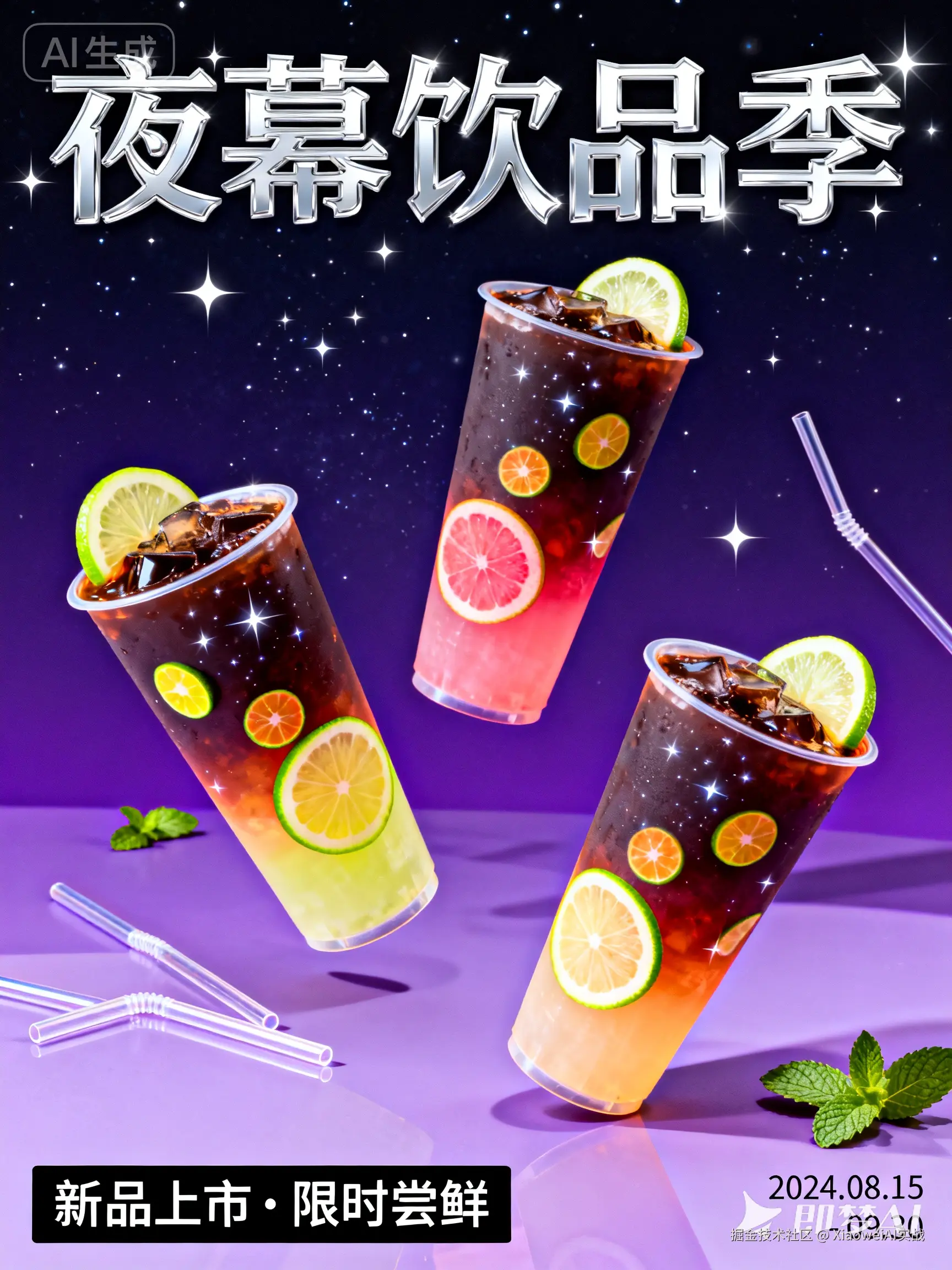 但在即梦AI里,你只需要告诉它:“帮我做一张新品推广海报,标题叫‘夜幕饮品季’。”