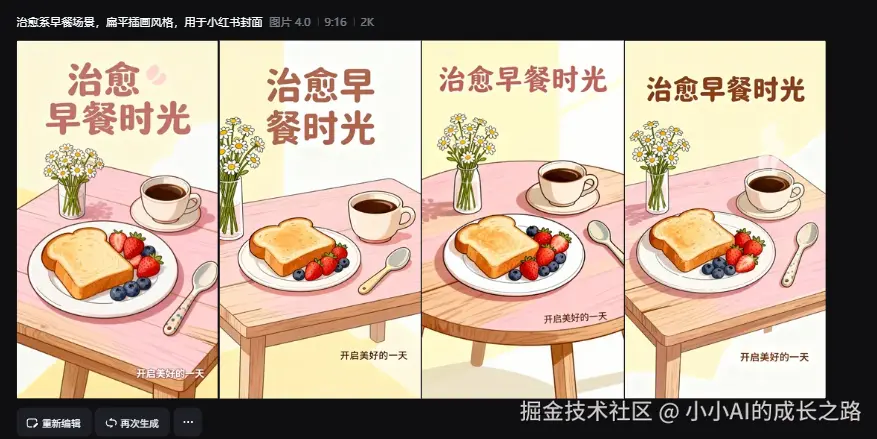 上周接了个急单,客户要"治愈系早餐场景,扁平插画风格,用于小红书封面",给了一组参考图。我直接用即梦AI的"参考图"功能开干: