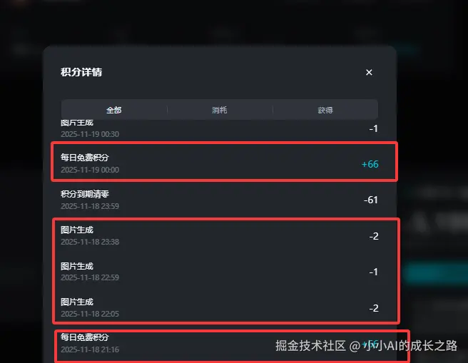即梦AI每天登录送60-100积分,生成一张图1-2积分,轻度使用完全免费。