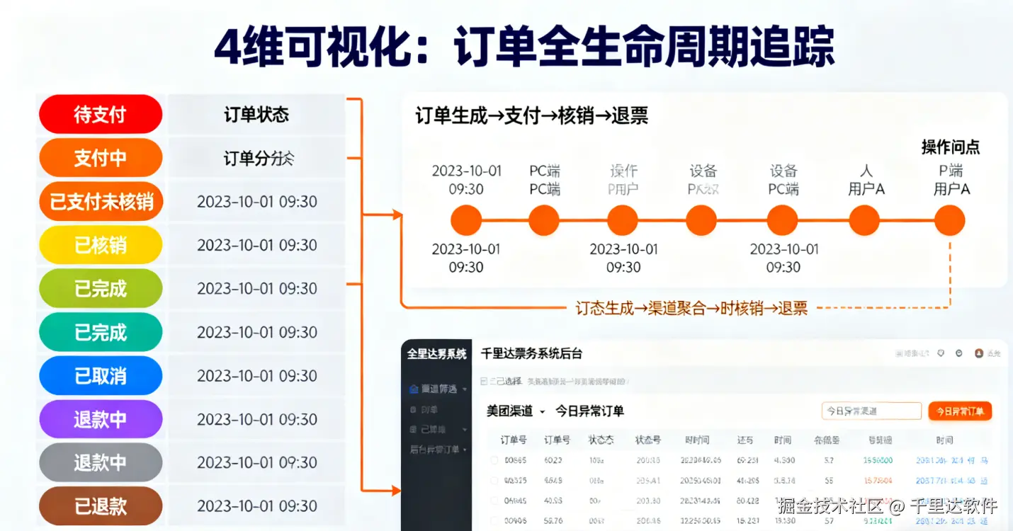 订单状态追踪的核心是 “让每个订单的全生命周期都清晰可见”。千里达景区票务系统的后台从 “状态分类、渠道聚合、时间轴、数据关联”4 个维度设计,确保运营者快速掌握订单动态: